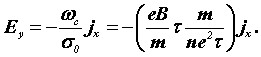 Пусть по проводнику вдоль оси х течет ток j x при наличии магнитного поля  , т.е. направленного вдоль оси z. Под действием силы Лоренца, действующей на каждую заряженную частицу, возникают компоненты напряженности электрического поля E y и плотности j y. Уравнение (6.41) для движения электронов в металле принимает вид