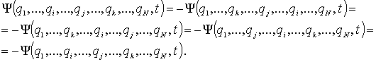 С помощью соотношения (6.5) можно показать, что если волновая функция  является решением уравнения Шредингера, то и волновая функция  , т.е. функция, получающаяся из  перестановкой координат  -ой и  -ой частиц, также является решением уравнения Шредингера.
