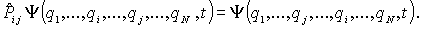 Введем оператор перестановки частиц в рассматриваемой системе  . Действие этого оператора заключается в том, что он переставляет местами  -ю и  -ю частицы системы. Так, например, если имеется зависящая от координат частиц системы функция  , то действие оператора перестановки  на эту функцию можно представить следующим образом
