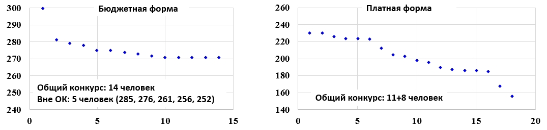 Средний балл бюджетного конкурса = 278, проходной балл на бюджетную форму обучения = 271.