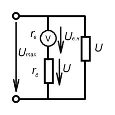 где Umax - наибольшее значение измеряемого напряжения (предел измерения напряжения вольтметром при наличии добавочного резистора); Uв,н — предельное (номинальное) значение напряжения прибора при отсутствии добавочного резистора. Отсюда