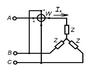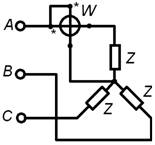 В этой схеме токовая обмотка включена в линейный провод А, а параллельная обмотка напряжения — на линейное напряжение UВС. Умножая показание ваттметра на 1.73, получаем значение реактивной мощности Q трехфазной сети при симметричной нагрузке.