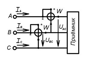 В трехпроводных системах трехфазного тока при симметричной и несимметричной нагрузках и любом способе соединения приемников широко распространена схема измерения мощности двумя ваттметрами (рис. 7.9 ).