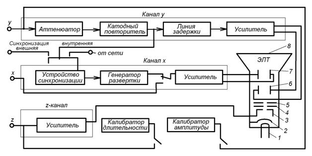 Основным узлом осциллографа является вакуумная электронно-лучевая трубка ЭЛТ, которая преобразует электрические сигналы в световое изображение. Катод 2, подогреваемый нитью накала 1, является источником свободных электронов, которые формируются в электронный луч и фокусируются первым анодом 4 на экране 8 ЭЛТ. Ускорение электронов луча осуществляется вторым анодом 5. При соударении электронов с экраном 8 их кинетическая энергия преобразуется в световое излучение посредством катодолюминофоров, т. е. веществ, светящихся под действием бомбардировки их электронами. Время послесвечения (после прекращения действия электронного луча) может составлять от 0,05 до 20 с и более. Изменяя отрицательный потенциал электрода 3 по отношению к катоду, можно воздействовать на значение тока электронного луча, а следовательно, и яркость свечения изображения на экране.