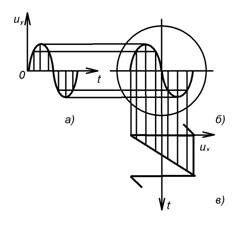 Для создания линейного масштаба по оси времени х необходимо равномерное перемещение электронного луча по горизонтали, что обеспечивается подачей на горизонтально отклоняющие пластины 7 ЭЛТ линейно нарастающего напряжения развертки (рис. 7.13, в). Если при этом отсутствует напряжение на вертикально отклоняющих пластинах б, на экране осциллографа появляется горизонтальная линия. При одновременной подаче исследуемого напряжения (рис. 7.1З,а) на пластины б и напряжения развертки на экране осциллографа появляется осциллограмма (рис.7.13,б), дающая полное представление о форме, амплитуде, частоте исследуемого напряжения.