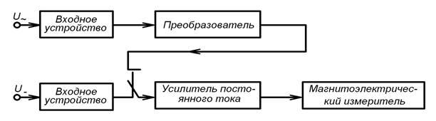 В радиоэлектронных цепях к вольтметрам, как и другим измерительным приборам, предъявляются повышенные требования, такие как ничтожно малое потребление мощности, частотный диапазон измеряемого напряжения от единиц герц до сотен мегагерц, и в то же время слабая зависимость показаний от частоты измеряемого напряжения, высокая чувствительность и т. д. Этим требованиям не соответствуют стрелочные вольтметры, которые осуществляют непосредственную оценку (прямой отсчет) измеряемого напряжения. Вышеперечисленным требованиям удовлетворяют аналоговые электронные вольтметры, использующие усилители измеряемых напряжений. С учетом назначения электронные вольтметры подразделяются на вольтметры: постоянного и переменного тока, импульсного напряжения, универсальные и др. Функциональная схема универсального аналогового электронного вольтметра представлена на рис. 7.14, данный вольтметр является универсальным, т. е. предназначен для измерений в цепях как постоянного, так и переменного тока.