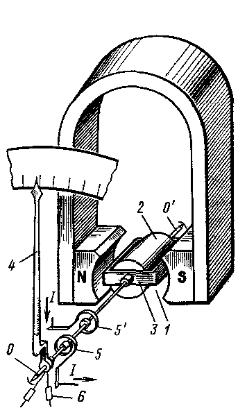 Рамка жестко соединена с двумя полуосями О и О', которые своими концами опираются о подшипники. На полуоси О закреплены указательная стрелка 4 и две спиральные пружинки 5 и 5', через которые к катушке подводится измеряемый ток I, противовесы 6. Полюсные наконечники NS и стальной цилиндр 2 обеспечивают в зазоре 1 равномерное радиальное магнитное поле с индукцией В. В результате взаимодействия магнитного поля с током в проводниках обмоти 3 создается вращающий момент. Рамка с обмоткой при этом поворачивается и стрелка отклоняется на угол a. Электромагнитная сила, действующая на обмотку, равна: Fэм=wBlI.