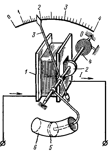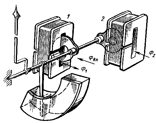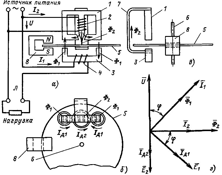 Основными элементами прибора являются: трехстержневой электромагнит 1 с обмоткой 2, имеющей большое число витков из тонкой проволоки; П-образный электромагнит 3 с обмоткой 4, имеющей небольшое число витков из толстой проволоки; алюминиевый диск 5, который может вращаться вокруг оси 6. Обмотка 2 включается параллельно измеряемой цепи, а обмотка 4 — последовательно с этой цепью. Ток I1 в катушке 4 образует магнитный поток Ф1 который дважды пересекает алюминиевый диск 5. Ток I2 в обмотке 2 создает магнитный поток, часть которого Ф2 также пронизывает диск 5 (поток Ф2 замыкается по стальной скобе 7).