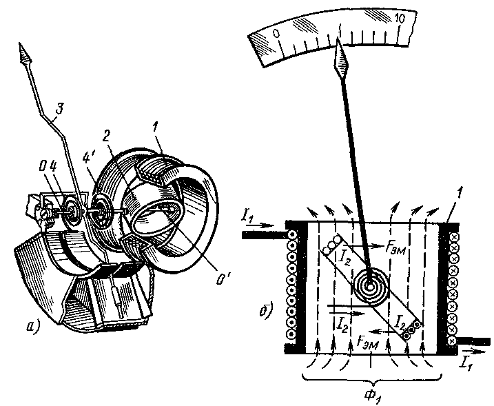 Приборы этой системы (рис. 7.4,а) состоят из двух обмоток: неподвижной 1 и подвижной 2. Подвижная обмотка укреплена на оси OO' и расположена внутри неподвижной обмотки. На оси OO' подвижной обмотки укреплены указательная стрелка 3 и спиральные пружинки 4 и 4', через которые подводится ток к обмотке 2. Эти же пружинки создают противодействующий момент Мпр, пропорциональный углу закручивания a. Принцип действия прибора (рис. 7.4,б) основан на взаимодействии тока I2 подвижной обмотки с магнитным потоком Ф1, неподвижной обмотки.