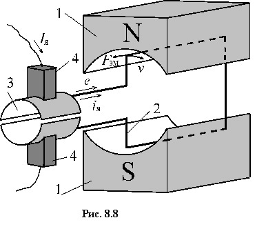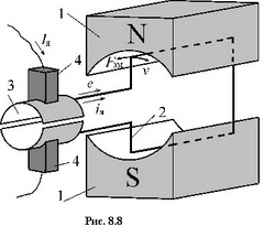 Наиболее специфическим элементом машин постоянного тока (МПТ) является коллектор – механический коммутатор. Особенности его работы поясняет рис. 8.8, где показана наиболее простая модель МПТ. Между неподвижными полюсами, создаваемыми постоянными магнитами или обмоткой возбуждения 1, находится подвижный виток (обмотка якоря) 8. Верхняя и нижняя части витка имеют электрический контакт с двумя медными цилиндрическими пластинами (3), называемыми коллекторными пластинами. Пластины не имеют электрического контакта между собой и вращаются вместе с якорем. К ним прижаты графитовые стержни (4) – щетки. Каждая щетка и соответствующая ей пластина образуют скользящий электрический контакт.