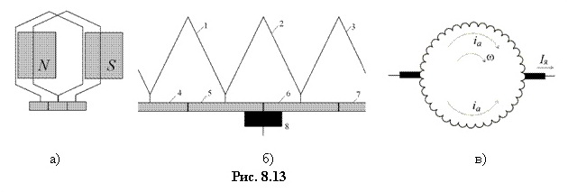 Выводы якорной обмотки присоединяются к коллекторным пластинам, вращающимся вместе с якорем. Щетки, располагаемые в специальных щеткодержателях (рис. 8.12 в), для улучшения электрического контакта плотно прижаты коллекторным пластинам. Независимо от способа выполнения якорной обмотки, общий принцип подключения ее секций к коллекторным пластинам можно условно изобразить, как на рис. 8.13,б, где он показан для трех соседних секций, обозначенных 1, 2, 3 и четырех соседних коллекторных пластин, обозначенных 4, 5, 6, 7, соответственно. На рис. 8.13 б также условно показана щетка 8, относительно которой перемещаются коллекторные пластины.
