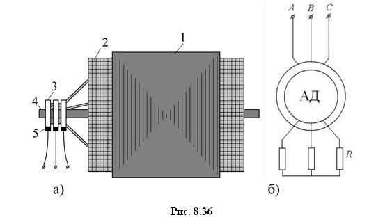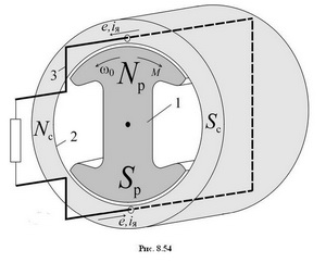 Генераторный режим. При вращении полюсов ротора 1 на рис. 8.54 с угловой скоростью омега0 внешним источником механической мощности в направлении против часовой стрелки создается вращающееся относительно статора 2 магнитное поле и в замкнутом на внешний резистор витке наводится ЭДС е и течет ток iя, изменяющиеся с частотой