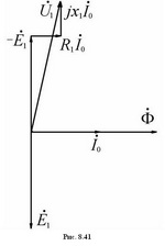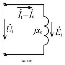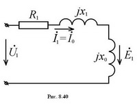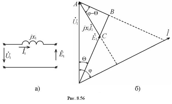 Наиболее простой вид имеет схема замещения фазной обмотки статора неявнополюсной синхронной машины. Если пренебречь активным сопротивлением фазы, прикладываемое к фазе напряжение U1 уравновешивается лишь наводимой в ней ЭДС Е1. Поэтому схема замещения фазы может быть представлена только реактивным сопротивлением x1, обусловленным потоком рассеяния, как на рис. 8.56,а. Векторная диаграмма, соответствующая этой схеме, представлена на рис. 8.56,б.