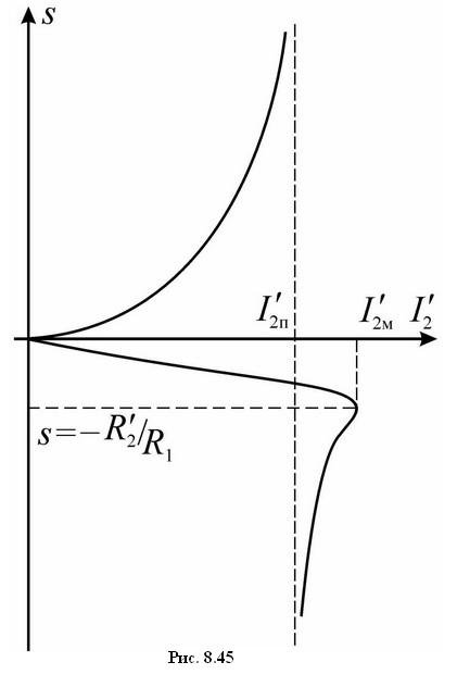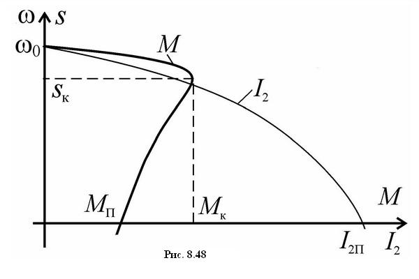 Для двигателей с к.з. ротором принципиальное значение имеет соотношение между током I2П и моментом МП при нулевой скорости, определяющее их пусковые свойства. Из рассмотрения рис. 8.48 видно, что в двигательном режиме работы АД имеет максимальный ток в начальный момент пуска. Для обычных двигателей кратность превышения пусковым током номинального значения обычно составляет от 5 до 7. Наоборот, пусковой момент относительно мал и составляет обычно от 1,2 до 1.4 от номинального значения момента. Это является принципиальной особенностью АД с к.з. ротором.