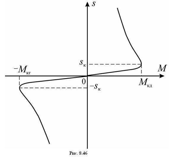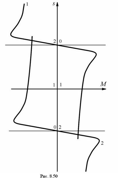 На рис. 8.50 показаны механические характеристики асинхронного двигателя M(s) для прямого (кривая 1) и обратного (кривая 2) направлений вращения. Реверс двигателя осуществляется изменением направления вращения поля статора посредством изменения чередования подключения фазных обмоток статора к источнику трехфазного напряжения. Участки обеих характеристик, расположенные в первом и третьем квадрантах, соответствуют двигательному режиму работы АД, а во втором и четвертом квадрантах – тормозным режимам.