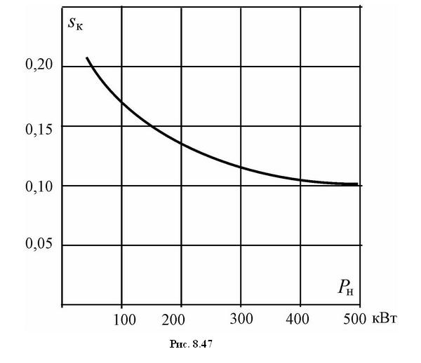 Это наиболее нелинейная часть механической характеристики. В установившемся режиме работы АД (при движении с постоянной скоростью) она практически не используется. Критическое скольжение с увеличением мощности асинхронных двигателей уменьшается. Для общепромышленных машин зависимость sк от номинальной мощности двигателя Рн примерно имеет вид, как показано на рис. 8.47.