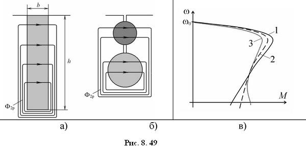 На рис. 8.49,в для сравнения показан примерный вид механических характеристик АД с обычным ротором (кривая 1), с глубоким пазом (кривая 2) и с двойной беличьей клеткой (кривая 3). Как видно, увеличение пускового момента происходит при некотором снижении критического момента. Это является следствием возрастания индуктивного сопротивления рассеяния обмотки ротора.