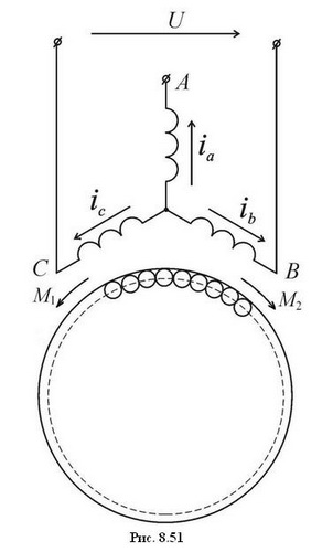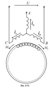 Наиболее просто такой двигатель можно получить из трехфазного, если одну из фазных обмоток отключить от источника питания, а две другие подключить к однофазному источнику (см. рис. 8.51). Реально такой режим возникает в аварийном режиме работы трехфазного двигателя при обрыве одной из фаз. Однако необходимо учитывать, что при одинаковых габаритах мощность однофазного двигателя составляет примерно 50 – 60% мощности трехфазного. Поэтому нарушение питания одной из фаз трехфазного двигателя, особенно с номинальной нагрузкой, влечет чрезмерное увеличение тока в обмотках и, как следствие, может явиться причиной выхода его из строя.