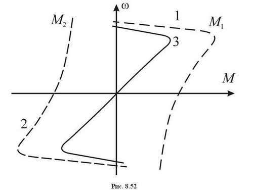 Однофазный ток статора создает пульсирующее магнитное поле, которое можно разложить на две составляющих, имеющих равные амплитуды и вращающиеся в разные стороны с одинаковой скоростью. При взаимодействии этих полей с током ротора создаются моменты М1 и М2, изменение которых в функции скорости вращения ротора ω можно представить механическими характеристиками 1 и 2 (рис. 8.52). Сложив моменты, соответствующие этим характеристикам при одинаковой скорости, можно получить результирующую механическую характеристику 3, которая, как видно, проходит через начало координат. Это является следствием того, что при неподвижном роторе (s=1) обе составляющих поля создают одинаковые по величине и разные по знаку моменты. Поэтому такие двигатели не создают пускового момента.