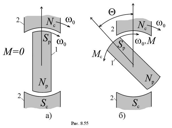 При отсутствии момента внешней нагрузки Мс оси полюсов ротора 1 и статора 2 совпадают и в идеале двигатель не развивает электромагнитного момента (реально развивает момент, покрывающий потери). Если же к валу двигателя приложен внешний момент Мс, под действием этого момента ротор отклоняется в сторону отставания по отношению к направлению движения на некоторый угол Θ. На полюса ротора действует электромагнитный момент М, направленный в сторону движения и стремящийся выравнить оси полюсов (рис. 8.55,б). Этот момент уравновешивает момент внешних сил Мс. Однако полюса ротора отставая от полюсов статора на угол Θ, при этом вращаются по-прежнему со скоростью ?0. Таким образом, в синхронной машине полюса ротора связаны с полюсами статора так называемой «магнитной пружиной», которая «сжимается» или «растягивается» в зависимости от нагрузки на валу. При этом средняя скорость вращения ротора всегда равна скорости вращения поля статора.