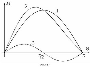 Зависимость М(Θ), построенная по (8.86), показана на рис. 8.57 (кривая 1). Как видно, электромагнитный момент синхронной машины зависит от угла рассогласования между напряжением и наводимой ЭДС или, что тоже самое, от угла между осями полюсов статора и ротора Θ. Поэтому зависимость М( Θ) получила название угловой или моментной характеристики, а угол Θ, соответственно, называют углом нагрузки.