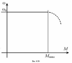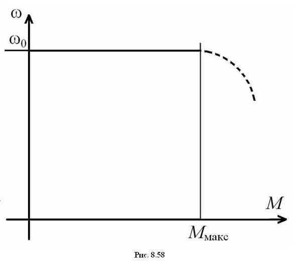 Максимального значения Мmax момент достигает, когда полюс ротора находится между полюсами статора, а угол нагрузки равен Θ = π/2. Это предельное значение момента нагрузки, при котором сохраняется синхронное вращение ротора. При превышении моментом нагрузки значения Мmax работоспособность двигателя нарушается, при этом обычно говорят, что двигатель выпадает из синхронизма. Таким образом, механическая характеристика синхронного двигателя представляет собой прямую, параллельную оси момента в пределах от - Мmax до Мmax (рис. 8.58).