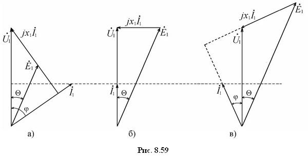 В недовозбужденной машине (рис. 8.59,а) вектор тока I1 отстает от вектора напряжения U1 на некоторый угол φ. В этом случае иногда говорят, что машина работает с отстающим коэффициентом мощности cosφ (реактивная мощность потребляется из сети). С увеличением тока возбуждения растет наводимая в обмотках статора ЭДС Е1 и при некотором ее значении вектор тока I1 может совпасть по направлению с вектором напряжения U1 (рис. 8.59,б). В этом случае машина потребляет из сети только активную составляющую тока I1 и cosφ = 1. Это наиболее благоприятный режим работы синхронной машины, т.к. при минимальном потребляемом токе потери, выделяемые в ней, также будут минимальными.