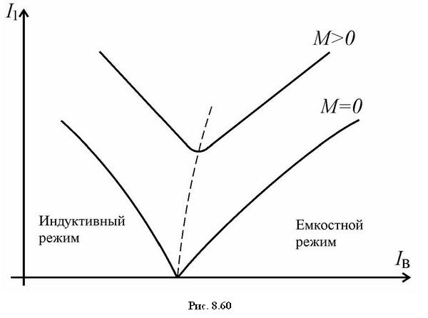 В перевозбужденной машине, как показано на рис. 8.59,в (при дальнейшем увеличении тока возбуждения) и, соответственно, при дальнейшем возрастании ЭДС Е1, ток статора I1 начинает уже опережать по фазе напряжение U1. В результате cosφ становится опережающим и синхронный двигатель, потребляя из сети активный ток, является источником реактивного тока. Зависимость тока статора I1 от тока возбуждения Iв в функции развиваемого момента М имеет примерно вид, как показано на рис. 8.60. Минимуму тока на этих зависимостях, которые в соответствии со своим видом получили название U-образных характеристик синхронного двигателя, соответствует работа при cosφ = 1.