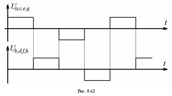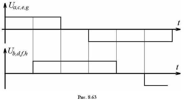 Если при исходном положении ротора, показанном на рис. 8.61,а при первой коммутации включить вторую фазу без отключения первой, то устойчивое положение ротора смещается относительно начального положения не на 45°, а на 22,5°. Затем при второй коммутации первая фаза отключается, а вторая остается включенной и положение устойчивого положения ротора вновь смещается на 22,5°. В дальнейшем при сохранении состояния второй фазы включается первая фаза в противоположной полярности и т.д. Временная диаграмма изменения напряжений на фазах ШД для этого способа коммутации показана на рис. 8.63.