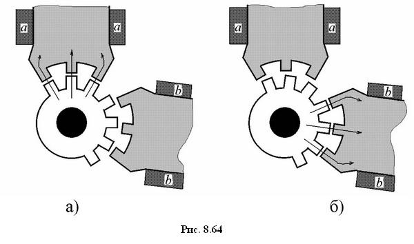 Реактивные ШД обычно имеют явновыраженные зубчатые полюса на статоре и зубчатый ротор, причем обмотки возбуждения располагаются только на статоре. При совпадении осей зубцов каких либо полюсов статора и ротора, оси зубцов ближайшего полюса статора и ротора сдвинуты на некоторый угол (рис. 8.64). Вращение ротора происходит при поочередном возбуждении полюсов статора. Зубчатый ротор всякий раз стремится занять положение, при котором оси зубцов возбужденного полюса статора и ротора совпадают, что соответствует минимальному магнитному сопротивлению воздушного промежутка между ними. В качестве примера на рис. 8.64,а показано взаимное положение взаимодействующих зубцов статора и ротора при подключении к источнику обмотки a, а рис. 8.64,б, обмотки b, соответственно. При большом числе зубцов ротора Zр его угол поворота значительно меньше угла поворота поля статора, что обеспечивает электромагнитную редукцию угла поворота ротора. Поэтому такие ШД иногда называют редукторными.