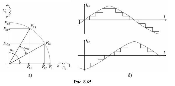 рис. 8.65,а). Поскольку угол поворота вектора результирующей МДС Fα с каждым переключением фаз ШД становится меньше, чем при обычном управлении, это влечет соответствующее уменьшение шага перемещения ротора ШД. Увеличивая число промежуточных уровней напряжений на фазах можно добиться значительного уменьшения дробного шага ?д по отношению к целому шагу αш при обычном управлении. Реально, для обеспечения равномерности и плавности перемещения ротора ШД форму его фазных токов приближают к синусоидальной. Примерный вид фазных токов iф,а и iф,в двухфазного ШД при дроблении его целого шага ?ш на три дробных шага αд показан на рис. 8.65,б.