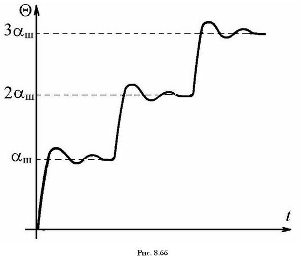 В режиме единичных шагов угол поворота ротора также складывается из последовательности шагов ротора, но команда на следующий шаг подается только после полной отработки предыдущего шага при нулевой скорости ротора. В результате, характер изменения во времени результирующего угла поворота ротора Θ примерно имеет вид, как показано, на рис. 8.66. Такой режим работы ШД получил название стартстопного. Один их характерных примеров использования этого режима – привод вращения стрелок кварцевых часов.