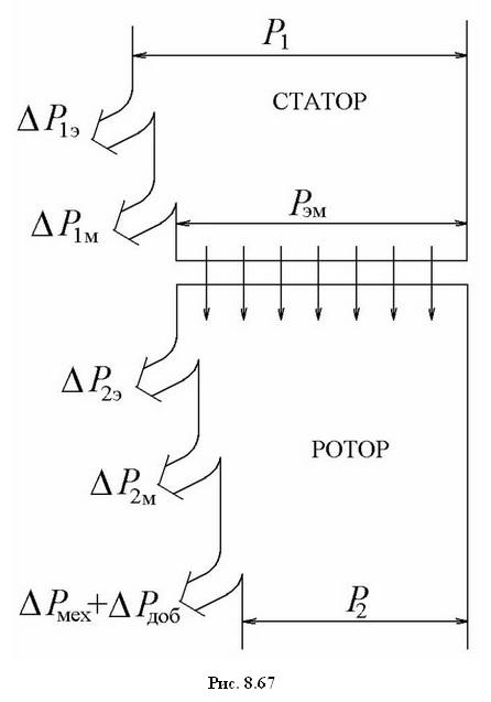 Обычно для наиболее наглядного представления энергетических соотношений в электрических машинах используют так называемые энергетические диаграммы. В качестве примера на рис. 8.67 показана энергетическая диаграмма асинхронного двигателя. В соответствии с этой диаграммой электромагнитная мощность Рэм, определяемая в соответствии с (8.39) через электромагнитный момент М и скорость идеального холостого хода ω0, отличается от потребляемой из сети мощности Р1 на величину электрических ΔР1э и магнитных ΔР1м потерь в статоре. Соответственно, выходная механическая мощность Р2 меньше электромагнитной мощности Рэм на величину электрических ΔР2э и магнитных ΔР2м потерь в роторе, а также механических ΔРмех и добавочных ΔРдоб потерь.