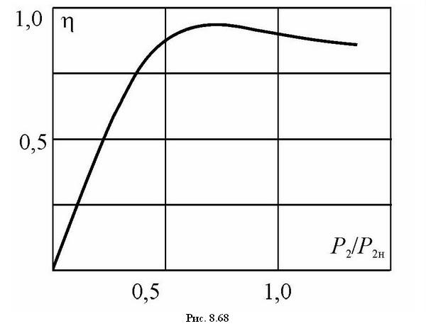 Учитывая, что полезная мощность растет примерно пропорционально току в силовой цепи двигателя, а электрические потери, в соответствии с (8.88), растут пропорционально квадрату тока, зависимость η(P2), имеет максимум, когда постоянные потери равны переменным. Обычно при проектировании электрических машин их параметры выбирают так, чтобы максимум КПД достигался при нагрузке 0,6 – 0,8 от номинальной нагрузки Р2н, т.к. в большинстве случаев они работают с недогрузкой в 15 – 20%. Типичный вид кривой η(P2/P2н) показан на рис. 8.68.