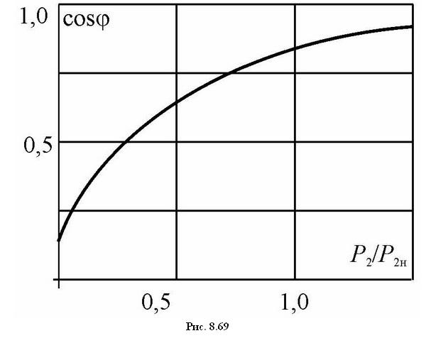 У машин обычного исполнения основной магнитный поток значительно превышает потоки рассеяния и практически не зависит от нагрузки, что дает основание в первом приближении считать Q1 величиной постоянной. Тогда, как следует из соотношения (8.92), изменение cosφ связано только с изменением мощности нагрузки на валу Р2 и потерь ΔРΣ. Примерный вид зависимости cosφ(P2/P2н) для асинхронных двигателей общепромышленного исполнения показан на рис. 8.69.
