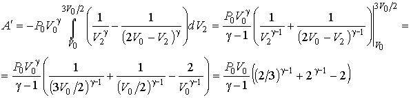 Пусть происходит уменьшение в два раза половины сосуда, описываемой объемом , то есть объем изменяется от до . Соответственно объем увеличивается от до . Тогда элементарная работа, совершаемая над газом, будет определяться разностью давлений в двух частях сосуда: