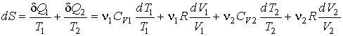 Будем считать, что рассматриваемый процесс смешивания газов и выравнивания их температур является квазиравновесным. Тогда в соответствии с формулой (3.52) и первым началом термодинамики можно записать