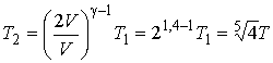 При адиабатическом сжатии газа поршнем увеличение его внутренней энергии равно работе, совершенной поршнем. Температура и давление газа в конце процесса могут быть найдены с помощью соотношений (2.86) и (2.85), из которых имеем: