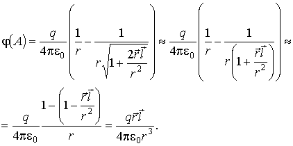 где  - угол между вектором  и направлением на точку наблюдения  . Заметим, что если сравнивать между собой потенциал поля точечного заряда и потенциал поля диполя, легко увидеть, что потенциал поля диполя убывает с расстоянием быстрее, чем потенциал поля точечного заряда.