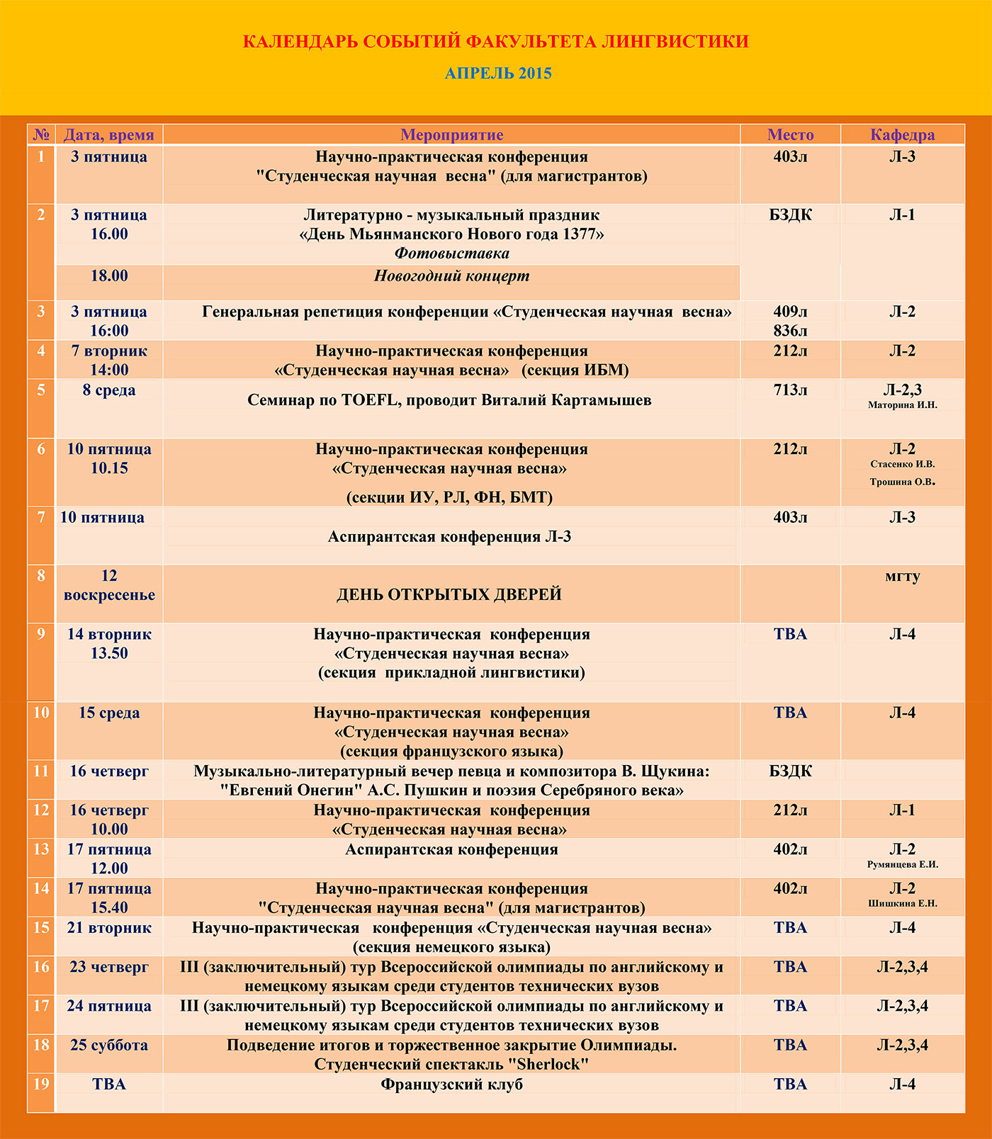 КАЛЕНДАРЬ СОБЫТИЙ ФАКУЛЬТЕТА Л АПРЕЛЬ 2015